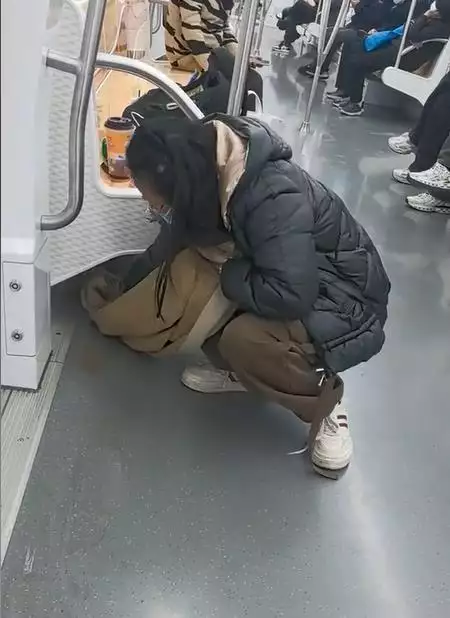 事情源于一段其他乘客拍摄的视频。视频显示,一位女乘客正蹲在地上,用自己的围巾擦地板。拍视频的乘客表示,这位女乘客的奶茶撒了,就用自己的围巾擦,保持公共场所的卫生,值得赞扬。