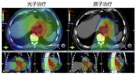 ▲一例食管癌患者的光子治疗对比质子治疗计划的等剂量曲线图;红色为高剂量区(也是肿瘤所在的区域),绿色为中等剂量区,蓝色为低剂量区;可见质子治疗计划对周围正常组织的保护作用更为显著